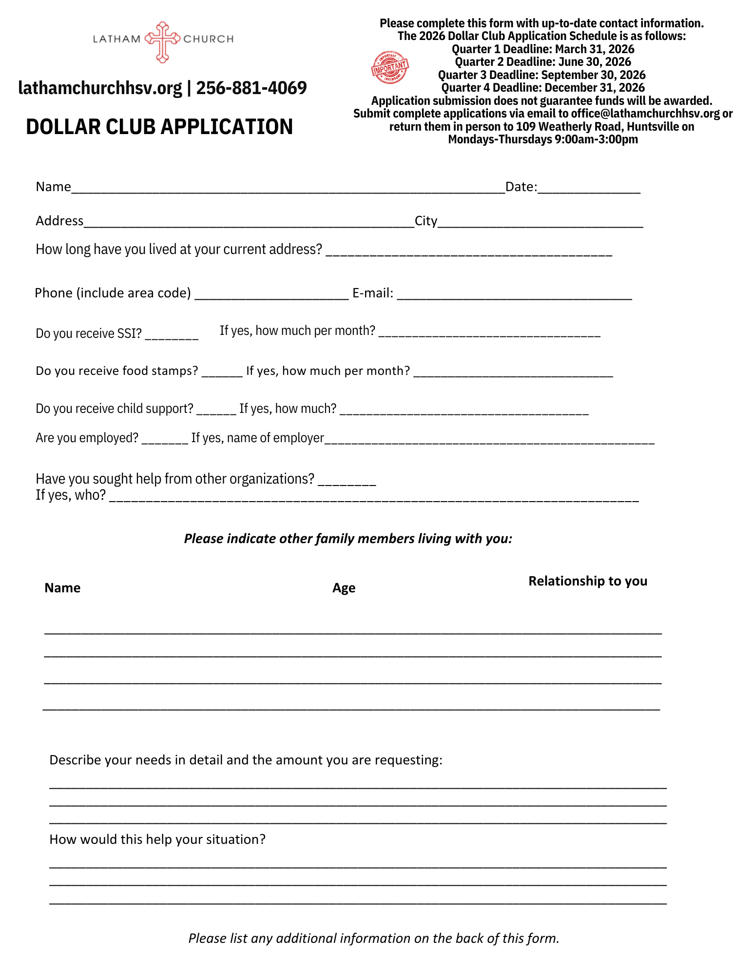 Scroll down to download our application- you can submit your COMPLETED application via email to office@lathamchurchhsv.org or return it in person to 109 Weatherly Road, Huntsville MONDAY-THURSDAYS 9:00AM TO 3:00PM.